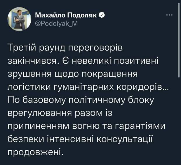 На переговорах с РФ есть позитивные подвижки по вопросам улучшения логистики гуманитарных коридоров. Интенсивные консультации по политическому блоку продолжатся — советник главы офиса Зеленского Подоляк.